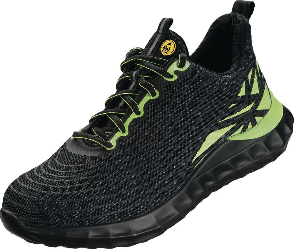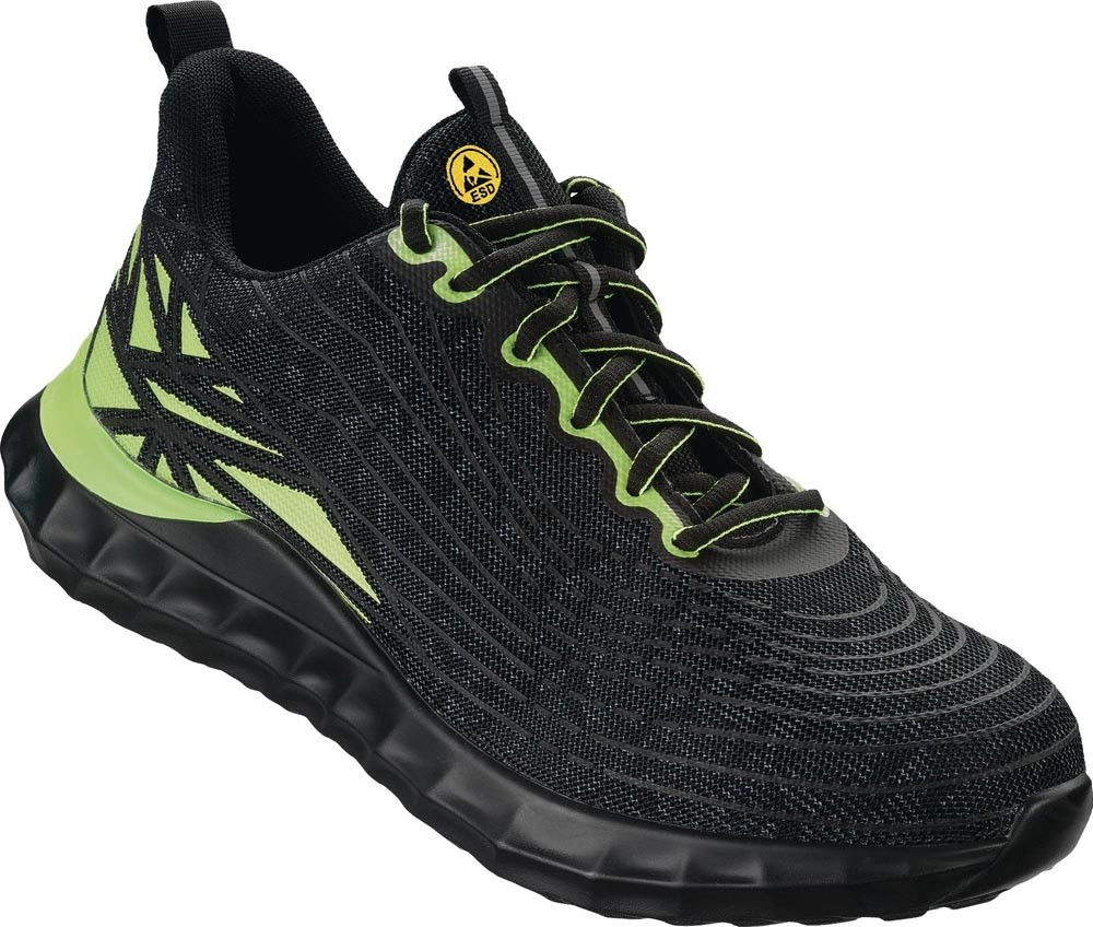 nach EN ISO 20345 S1 PS FO SR ESD Farbe: schwarz/grün · Schaft aus leichtem atmungsaktivem Mesh-Material · ergonomisch geformter gepolsterter Schaftrand · gepolsterte Lasche mit Reflexstreifen · Verschluss mit Ösen · atmungsaktives Innenfutter · Anziehhilfe im Fersenbereich · herausnehmbares · anatomisches EVA-Fußbett · Stahlkappe und durchtrittsichere Gewebezwischensohle · antistatische · öl- und säurebeständige · rutschhemmende und strukturierte PU-Laufsohle · ESD · Weite 10,5