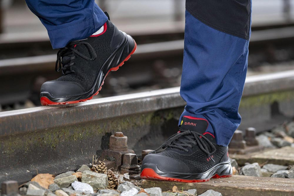 nach DIN EN ISO 20345:2024 · S1PS FO LG SR ESD · Textilmaterial mit TPU-Applikation · Sandwich-Textilfutter · Composite-Flexkappe · Baak Go&Relax-System · Balance-Zone · ESD Softstep+ Einlegesohle · PU/PU-Sohle · textiler Durchtrittschutz · DGUV Regel 112-191 · Weite 11