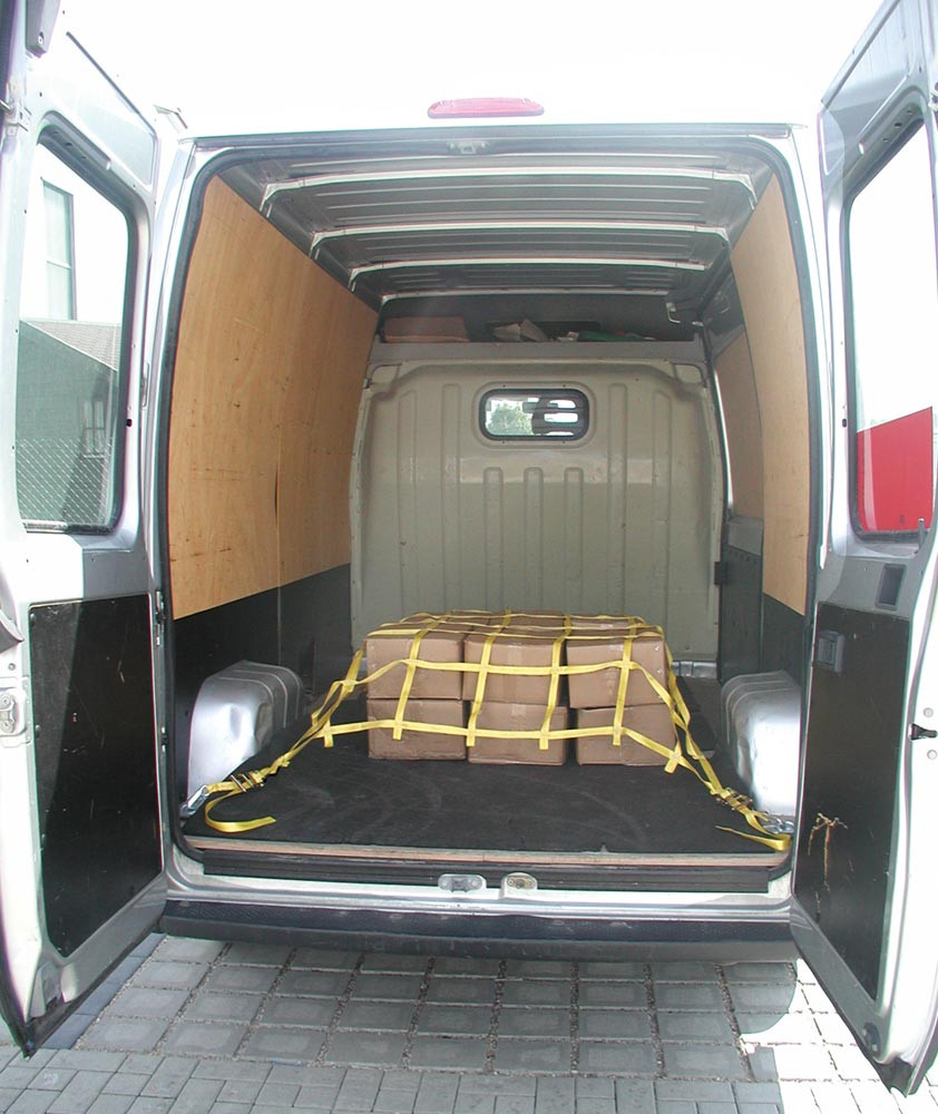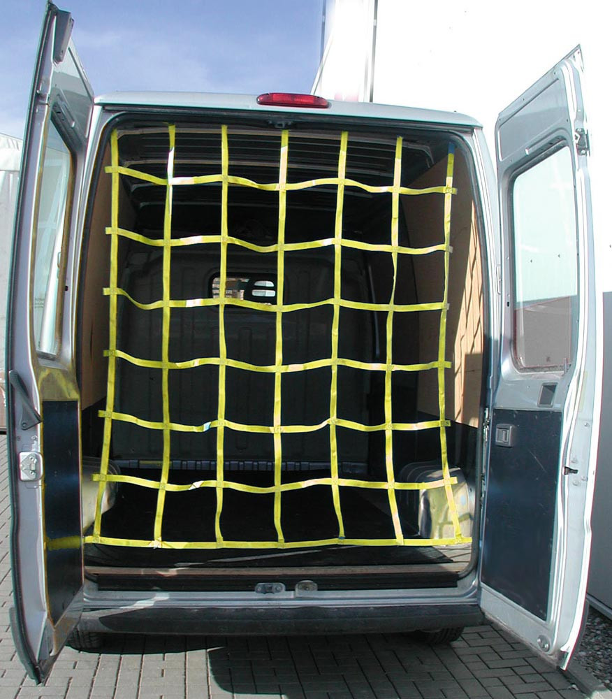 · Für Transporter und Anhänger · Zur Laderaumtrennung, rückwärtiger Ladungssicherung oder zum flächigen Niederzurren · Netz aus Gurtband · Bandbreite 25 mm · Maschenweite ca. 235 mm · Schlaufen an seitlichen äußeren Maschenknoten · Losenden 1 m lang · Festenden mit Karabinerhaken 250 mm lang · Mit Ratsche, zul. Zugkraft 750 daN im geraden Zug · Inkl. Etikett · Farbe gelb