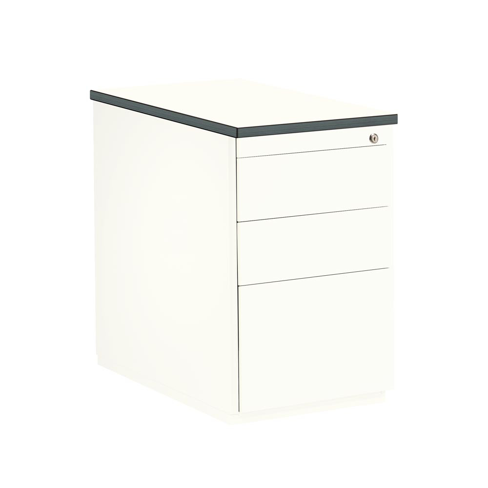 · Stabiles, verschweißtes Gehäuse aus wiederverwertbarem Stahl · Hochwertige Einbrennlackierung · Container sind gegen Kippen nach vorne gesichert · Schubladen serienmäßig mit soft-close-Dämpfungssystem · Unauffällige seitliche, leicht bedienbare Griffrinne · Sperre gegen Doppelauszug · Verschließbar über Dreh-Wechselkern-Zylinderschloss mit Klappschlüssel und Zweitschlüssel · Utensilienschub inkl. Fächerschale in soft-grip-Ausführung mit Weichkunststoff-Beschichtung · Abdeckplatte melaminharzbeschichtet mit ABS-Umleimer, 19 mm stark · Sockel 100 mm hoch · Traglast je Schublade 18 kg