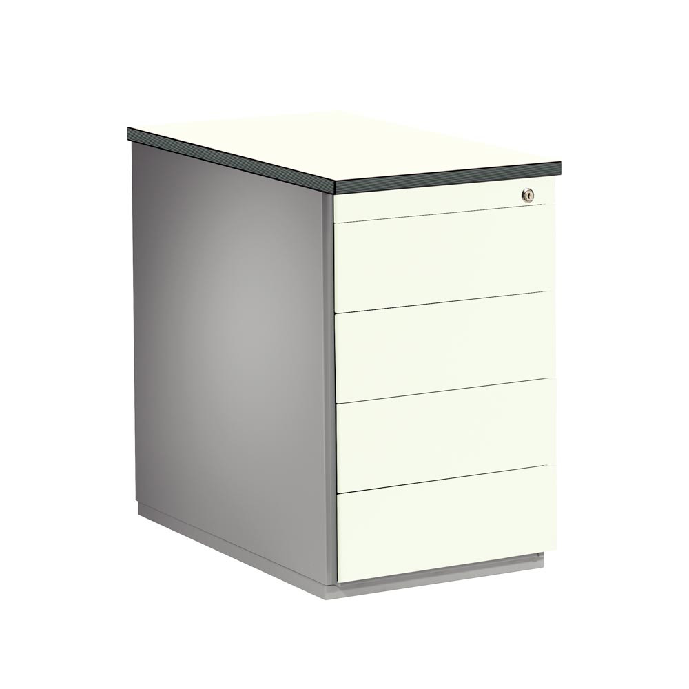 · Stabiles, verschweißtes Gehäuse aus wiederverwertbarem Stahl · Hochwertige Einbrennlackierung · Container sind gegen Kippen nach vorne gesichert · Schubladen serienmäßig mit soft-close-Dämpfungssystem · Unauffällige seitliche, leicht bedienbare Griffrinne · Sperre gegen Doppelauszug · Verschließbar über Dreh-Wechselkern-Zylinderschloss mit Klappschlüssel und Zweitschlüssel · Utensilienschub inkl. Fächerschale in soft-grip-Ausführung mit Weichkunststoff-Beschichtung · Abdeckplatte melaminharzbeschichtet mit ABS-Umleimer, 19 mm stark · Sockel 100 mm hoch · Traglast je Schublade 18 kg