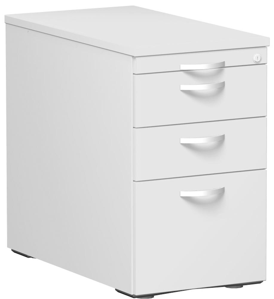 ∙ Vormontiert ∙ Hochwertige, melaminharzbeschichtete E-1-Spanplatten 19 mm stark, mit 2 mm ABS-Umleimer, Radius 2 mm gerundet · Utensilienschub (25 mm hoch, 2/3 ausziehbar), Schubladen (130 mm hoch, 5/6 ausziehbar), Hängeregistraturauszug (280 mm hoch, voll ausziehbar) · Teleskop-Auszugschienen mit Kugelführung · Einzelauszugssperre · Zentralverschluss mit Zylinderschloss ∙ Metallgriffe