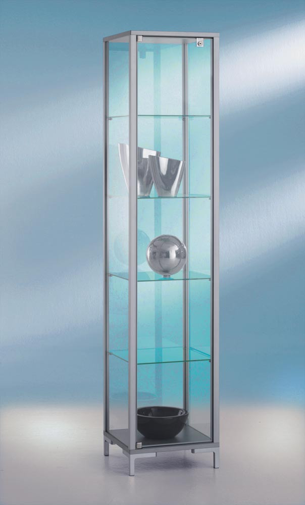 Standvitrine, BxTxH 400x400x1860 mm, Aluprofile, 4 Glasböden, Flügeltüren, Füße silber