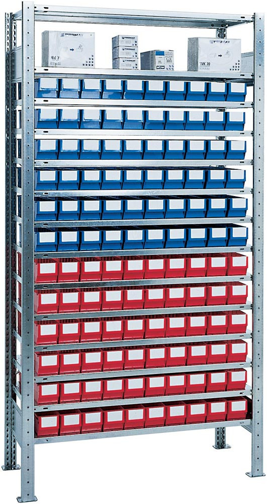 komplett mit PROMAT Lagerboxen und Sichtlagerkästen · einfache und schnelle Steckmontage mit vormontierten verzinkten Rahmen · Fachböden verzinkt mit verstärktem Kastenprofil, H 25 mm, höhenverstellbar im 25-mm-Raster · Tragfähigkeit pro Fachboden 150 kg · Feldlast 1300 kg