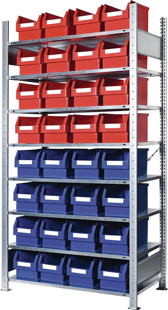 Steckregal H2000xB1000xT400mm Grundregal 8 Stahlböden 16 x Gr. 3 blau, 16 x Gr. 3 rot