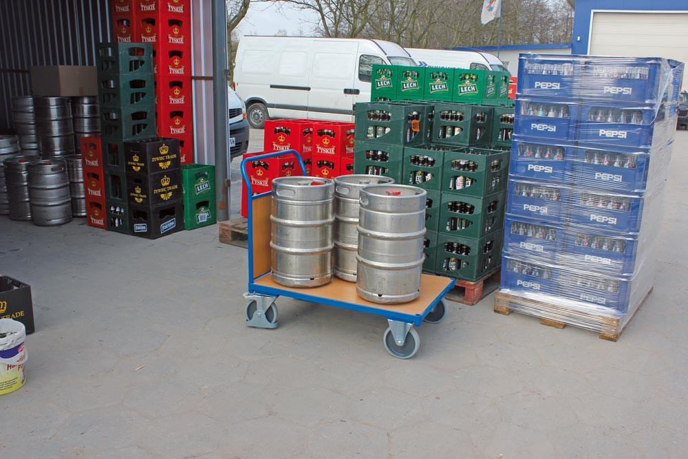 ∙ Schweißkonstruktion aus Stahlrohr und Profilstahl ∙ Schlag- und kratzfest ∙ Ladefläche und Stirnwände Holzwerkstoffplatte mit Buchendekor ∙ Stirn- und Längswandhöhe 515 mm ∙ 2 Lenk- und 2 Bockrollen · Lenkrollen gemäß EN 1757-3 mit zentraler Fußbremse EasySTOP und Fußschutz · Thermoplastische Vollgummi-Bereifung, grau "spurlos" · Naben mit Präzisions-Rillenkugellager und Fadenschutz