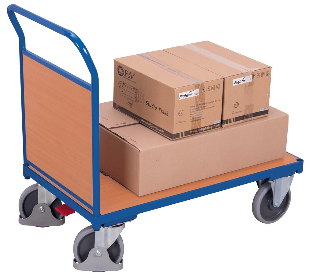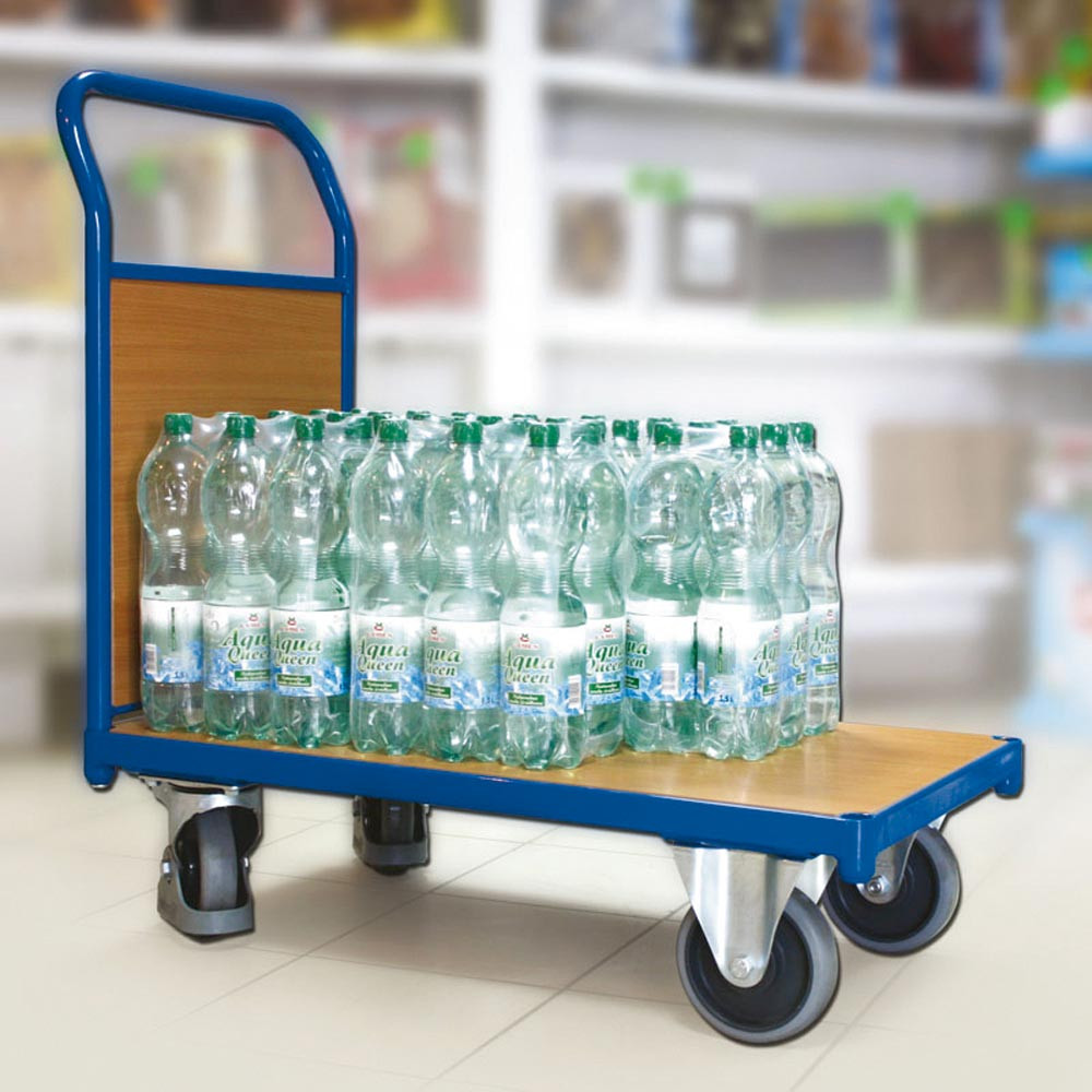 Stirnwandwagen mit Holzwand, Ladefläche LxB 1030x700 mm, Außenmaße LxBxH 1125x700x1015 mm, Traglast 500 kg, RAL 5010 enzianblau