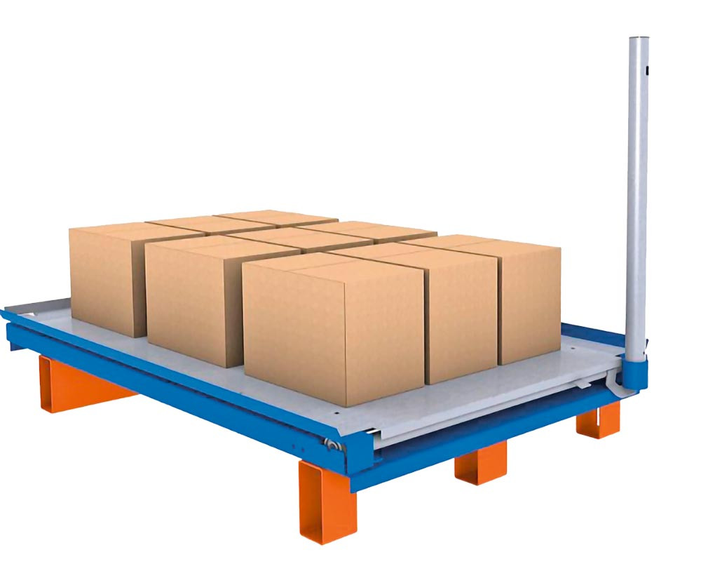 · Teleskopauszüge für Bodenebenen (für Holmebenen auf Anfrage erhältlich) · Höhe inkl. Handgriff 1035 mm · Für Regaltiefe 1.100 mm · Max. 2 Ebenen übereinander · Für Holmbreiten 50 mm · Palettenauszugstiefe 70 % · Immer gleiche Holmpaare verwenden · Holme müssen mit Ständern verschraubt werden (Aushebesicherung) · Rohrkonstruktion für Bodenebene · Es darf immer nur ein Auszug pro Feld betätigt werden · Palettenlast max. 800 kg pro Auszug bei 1 bis 3 Auszügen · Palettenlast reduziert auf max. 500 kg bei 4 Auszügen · Standardauszugsebenen müssen mit den hinteren Holmen verschraubt und gesichert werden · Bodenebenen werden nur auf dem Fußboden verankert · Handgriff nicht im Lieferumfang enthalten, bitte separat bestellen · Farbe blau/orange/verzinkt