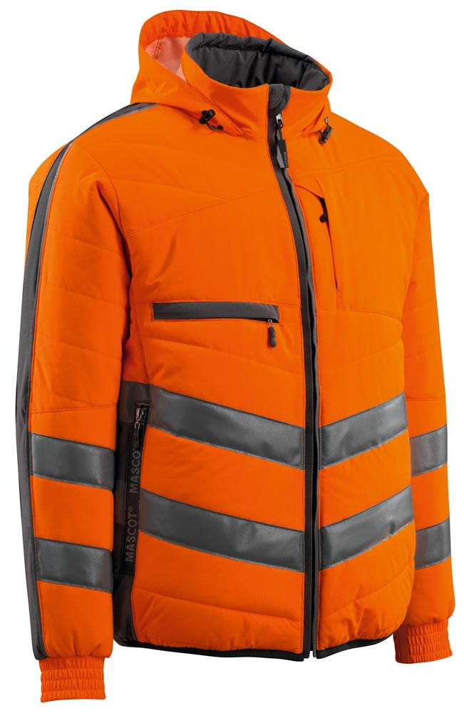 Nach EN ISO 20471 - Klasse 2 und Hi-Vis Gruppe A ∙ Aus 100% Polyester, ca. 300 g/m2 ∙ Atmungsaktiv, winddicht und wasserabweisend ∙ Wattiert mit Polyesterfüllung ∙ Verschluss mit Reißverschluss und inwendiger Wetterschutzleiste ∙ Kapuze kann zusammengefaltet und im Kragen untergebracht werden ∙ Reißverschlussinnentasche speziell für Handys entwickelt, mit Öffnung sowie Schlaufen für das Kopfhörerkabel ∙ Brusttaschen mit Reißverschluss ∙ D-Ring ∙ Stifttasche ∙ Vordertaschen mit Reißverschluss ∙ Für Industriewäsche-Kategorie C1 geeignet ∙ Zertifiziert nach OEKO-TEX® Standard 100