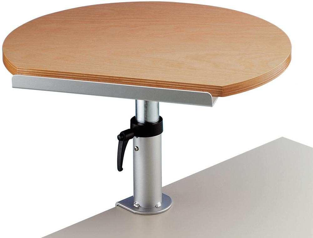 · Hochwertige Arbeitsplatte, besonders formstabil und leicht zu reinigen · Platte um 10° nach vorne neigbar und um 360° drehbar · Anschlagkante und Ablage für Stifte und Utensilien · Teleskopsäule aus Stahl, Ø 60 mm · Stufenlos höhenverstellbar · Fixierung ohne Kraftaufwand durch ergonomischen Klemmhebel · Klemmfuß, 100 mm breit, für Tischplatten bis 80 mm Stärke · Schreibtischschonende Unterlage · Höhe ab Schreibtischplatte 310-430 mm · Traglast 30 kg