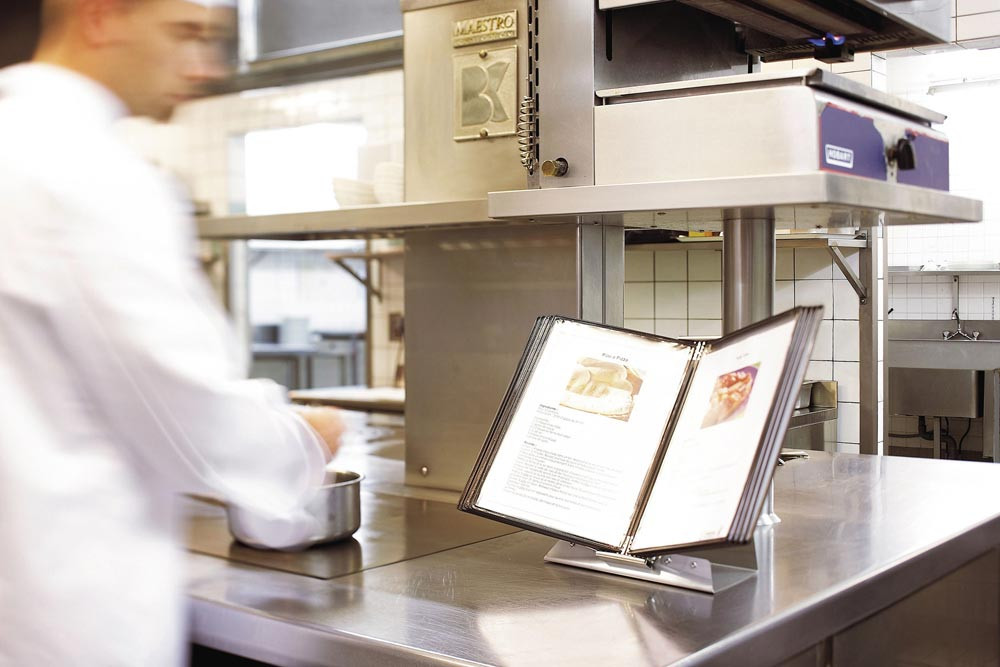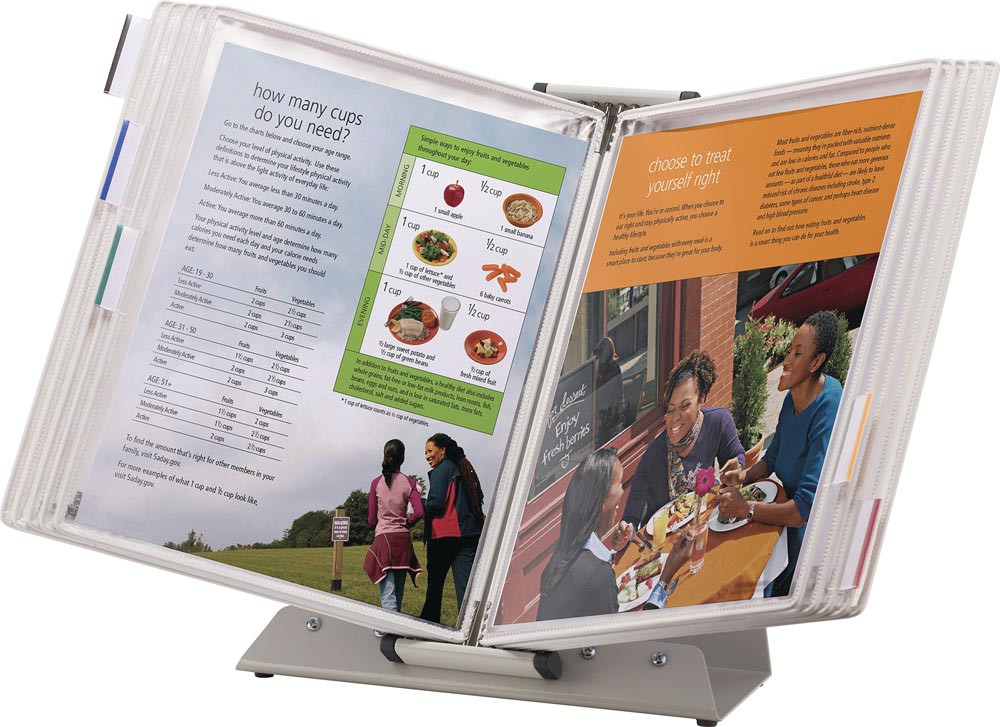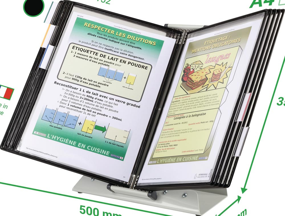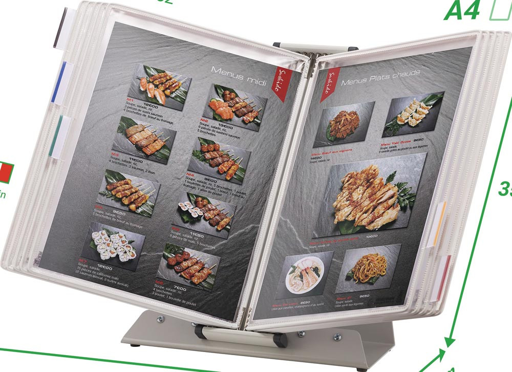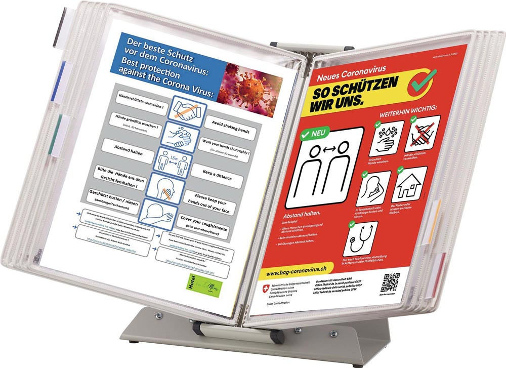 Komplett-Set · standfester Stahlblech-Tischständer, lichtgrau lackiert RAL 7035 (schräg gestellter Sockel) · mit 10 antibakteriellen Sichttafeln DIN A4 aus strapazierfähigem, flexiblem Kunststoff, mit kunststoffummanteltem Stahldraht · Öffnung oben · mit 5 Aufsteckreiter 50 mm · mit 4 Pluggers (Anschlagendstücke) für einen idealen Lesewinkel · kann mit 1 bis 2 Wandelementen auf 20 bis 30 Tafeln erweitert werden · Wandmontage möglich (Befestigungsmaterial nicht im Lieferumfang enthalten) · Sichttafeln Art.-Nr. 6463445: Farbe weiß