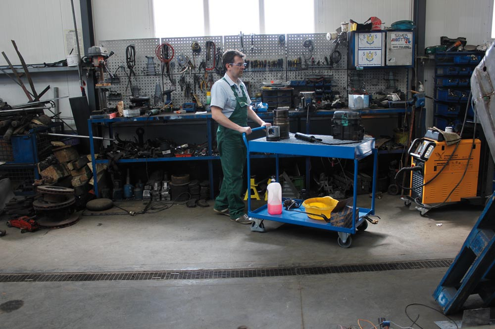 Tischwagen, 2 öldicht verschweißte Wannen, 1 Gitterrost, 1 Ablasshahn, Ladefläche LxB 995x595 mm, Außenmaße LxBxH 1125x610x1025 mm,TL 250 kg, RAL 5010