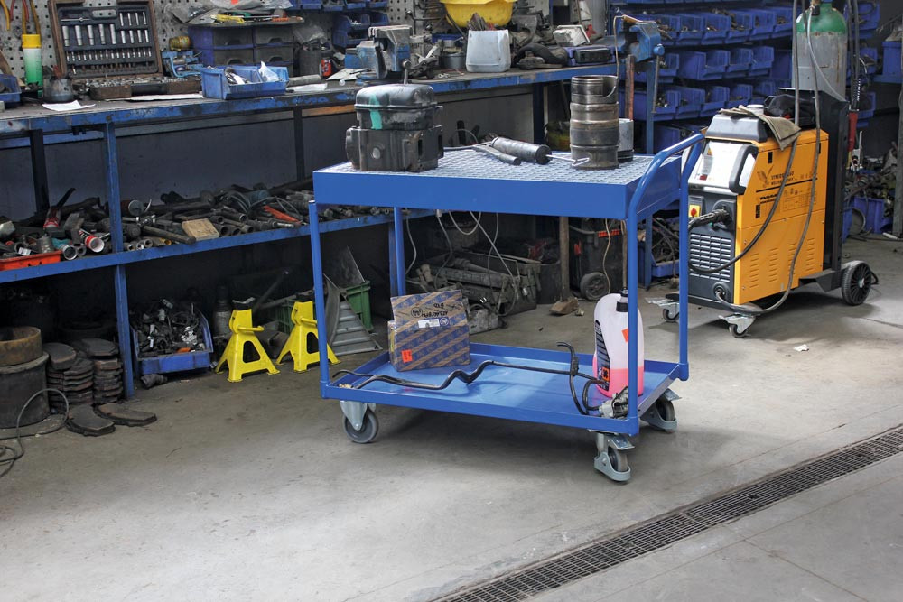 Tischwagen, 2 öldicht verschweißte Wannen, Ladefläche LxB 845x495 mm, Außenmaße LxBxH 985x500x910 mm, Traglast 400 kg, RAL 5010 enzianblau EP527671