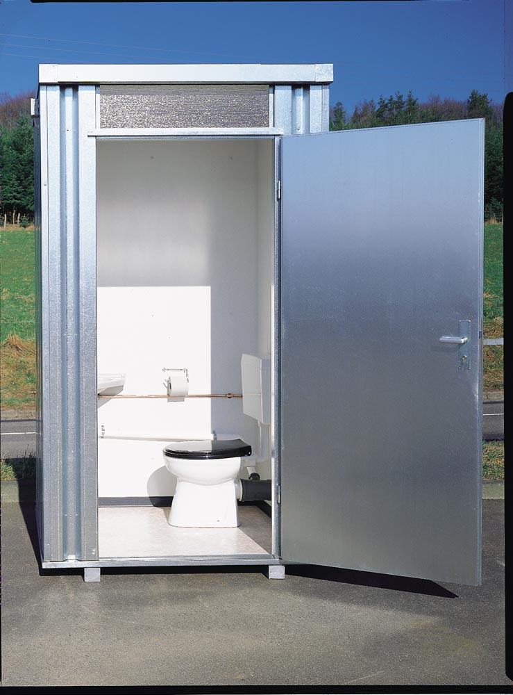 Toilettenbox, feuerverzinkt, inkl. Eckwaschbecken, Tiefspülklosett und 160 l Frischwassertank, BxTxH 1400x1250x2425 mm EP513910