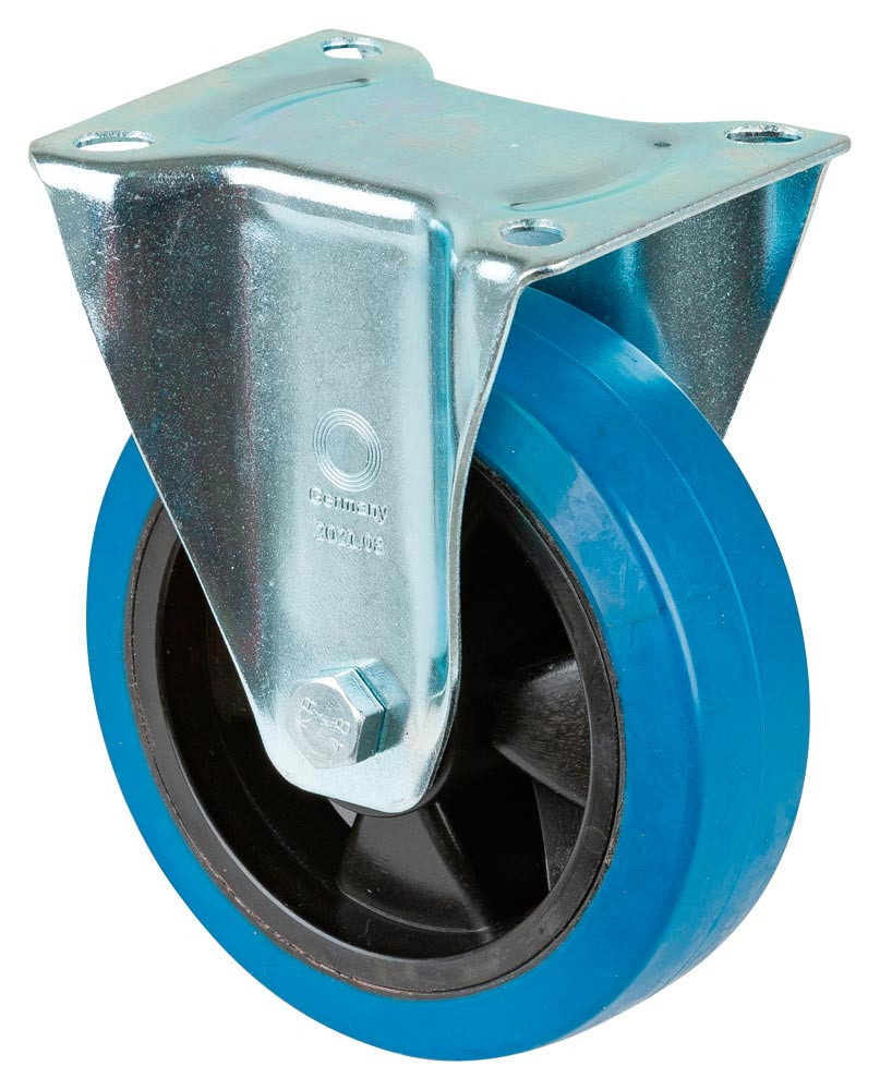 Transportgeräte-Bockrolle, Elastik-Vollgummi blau, Durchm. 160 mm, Traglast 300 kg, Kugellager, Anschraubplatte