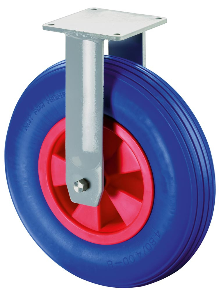 pannensicher · Gabel aus Stahlblech, verzinkt-chromatisiert, zweireihiger Kugelkranz im Gabelkopf · abriebfest, stoß- und geräuschdämpfend, wartungsfrei, nicht für Dauerbelastung geeignet · Polyurethanreifen (blau) · Radkörper Kunststoff rot · Rollenlager · mit Plattenbefestigung