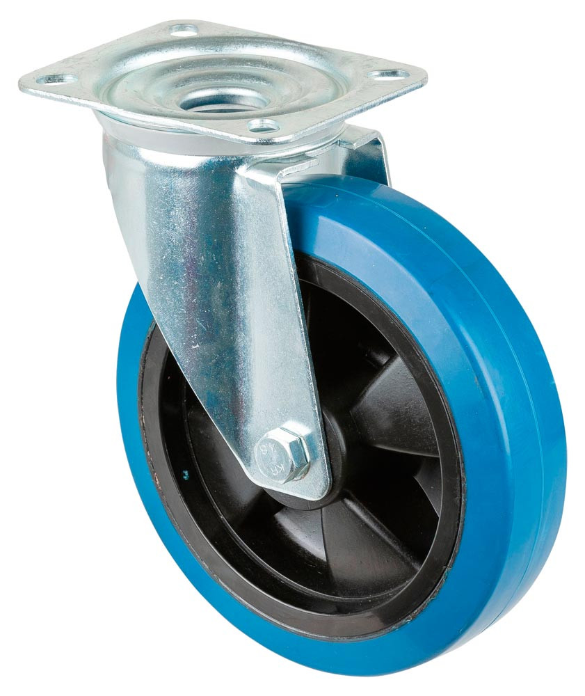 Transportgeräte-Lenkrolle, Elastik-Vollgummi blau, Durchm. 200 mm, Traglast 300 kg, Kugellager, Anschraubplatte
