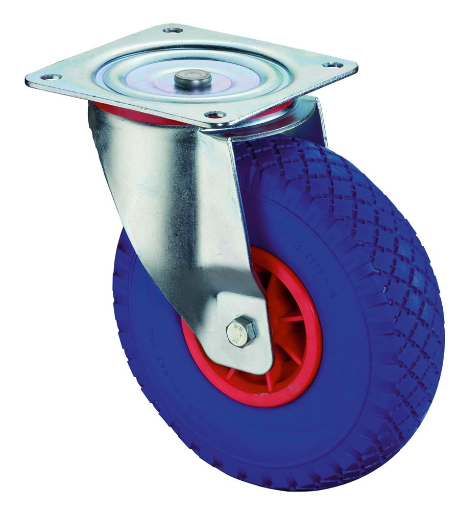 pannensicher · Gabel aus Stahlblech, verzinkt-chromatisiert, zweireihiger Kugelkranz im Gabelkopf · abriebfest, stoß- und geräuschdämpfend, wartungsfrei, nicht für Dauerbelastung geeignet · Polyurethanreifen (blau) · Radkörper Kunststoff rot · Rollenlager · mit Plattenbefestigung