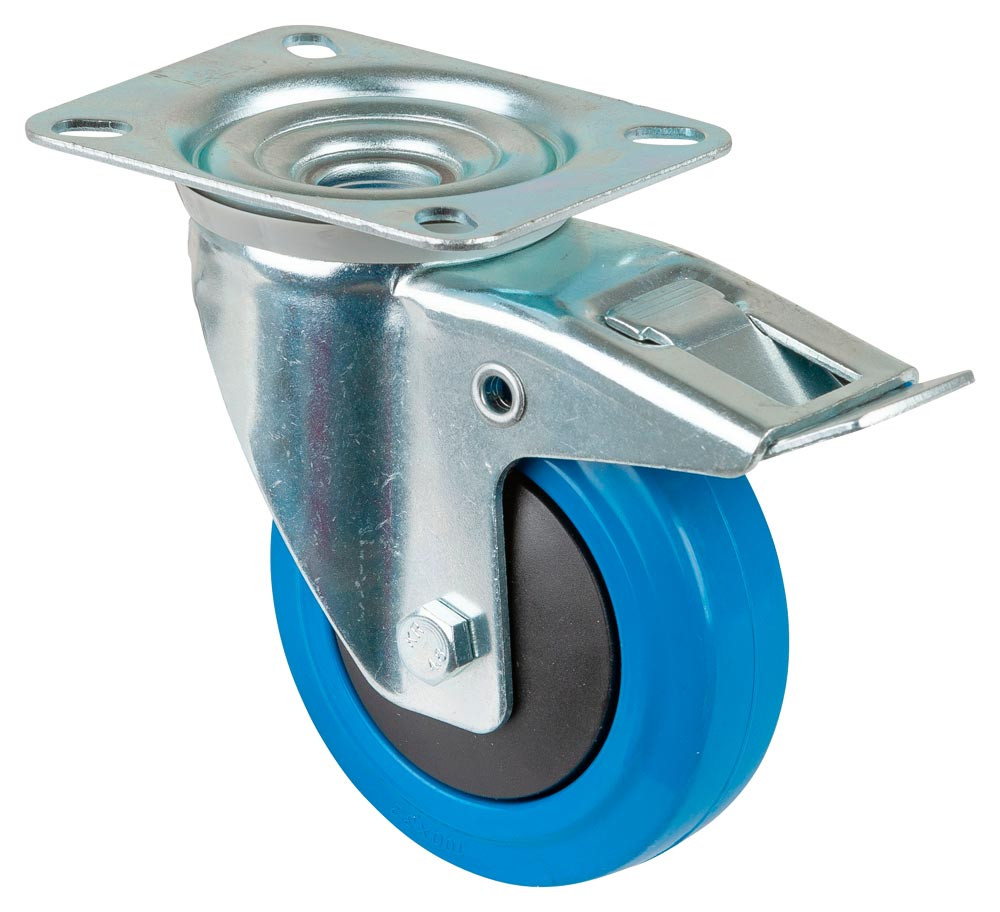 Transportgeräte-Lenkrolle m. Festst., Elastik-Vollgummi blau,Durchm. 100 mm, Traglast 150 kg, Kugellager, Anschraubplatte, Fadenschutz