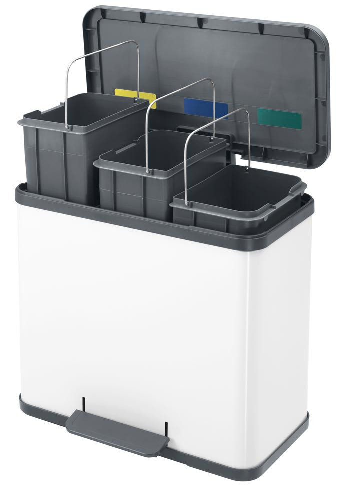 ∙ Rechteck-Gehäuse mit einzelnen Inneneimern zur Mülltrennung ∙ Stabil und standfest ∙ Deckel aus hochwertigem Kunststoff in schwarz mit Vertiefung zur Kennzeichnung der Abfallsortierung, inkl. Farbsticker zur Müllsorten-Kennzeichnung · Gedämpfter Deckel-Schließ-Mechanismus - Deckel schließt leise · Großer Öffnungswinkel zum leichten Befüllen · Ergonomischer Tragegriff im Deckelscharnier integriert · Ergonomisch breites Fußpedal · Innenliegende, hygienische Tretmechanik · Standfest durch breiten Bodenring