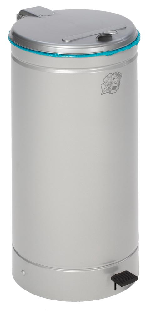 · Aus verzinktem Stahlblech · Für den Einsatz von 60-70 Liter Kunststoffsäcken · Mit bequemer Fußpedalbetätigung, einem Kunststoffdeckel und einem Klemmring zur Müllsackbefestigung · Einfüllöffnung ca. 350 mm · Durchmesser 450 mm, Höhe 700 mm