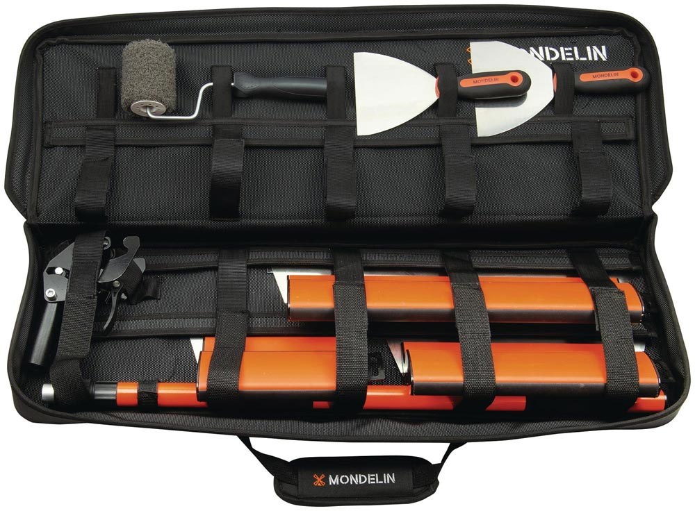 zum Spachteln, Glätten, Schneiden und Arbeiten an Fugen · textile Tasche mit integrierten Klingenschützern, Klettfixierung, Tragegriffen und Schultergurt · leicht, waschbar und ideal für den mobilen Einsatz