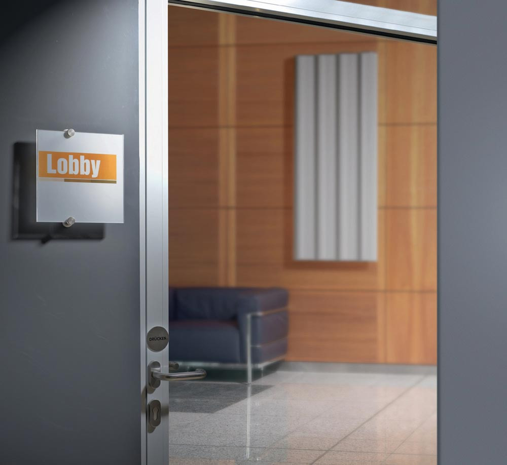 elegantes, zeitloses Türschild · aus hochwertigem Acrylglas und einer semi-transluzenten Folie · Folie wird zwischen die beiden polierten, stabilen Acrylplatten gelegt und durch Schrauben an der Wand fixiert · einfache Montage durch Aufbauanleitung · Folienschilder lassen sich durch eine Perforation leicht aus dem A4-Format trennen und sind Farb- sowie s/w Laserdrucker geeignet