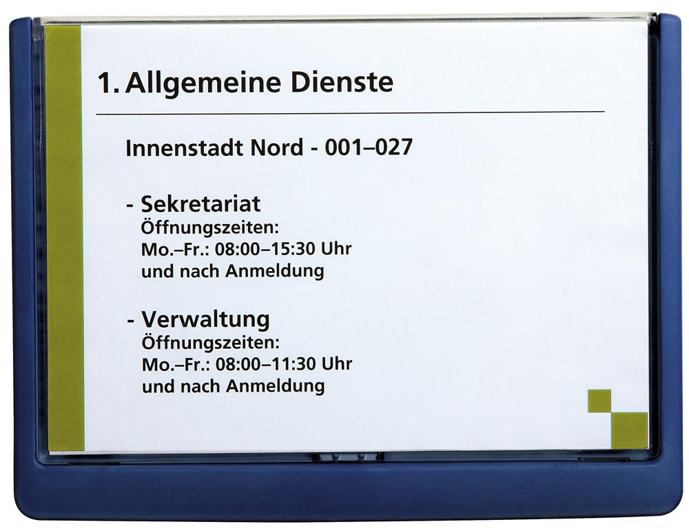 Türschild aus ABS, Sichtfenster Acryl, Klick-Funktion, BxH 210x148,5 mm (DIN A5), Rahmenfarbe blau, VE 1 Stück, Mindestbestellmenge 3 Stück