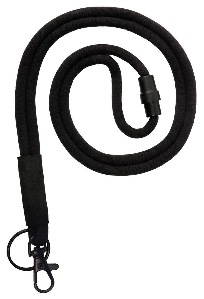 · Rundes Polyesterband mit Softhaptik · Bandlänge 460 mm · Mit Nichterstickungsverschluss · Mit Schlüsselring Ø 25 mm und Karabinerhaken · VE 30 Stück