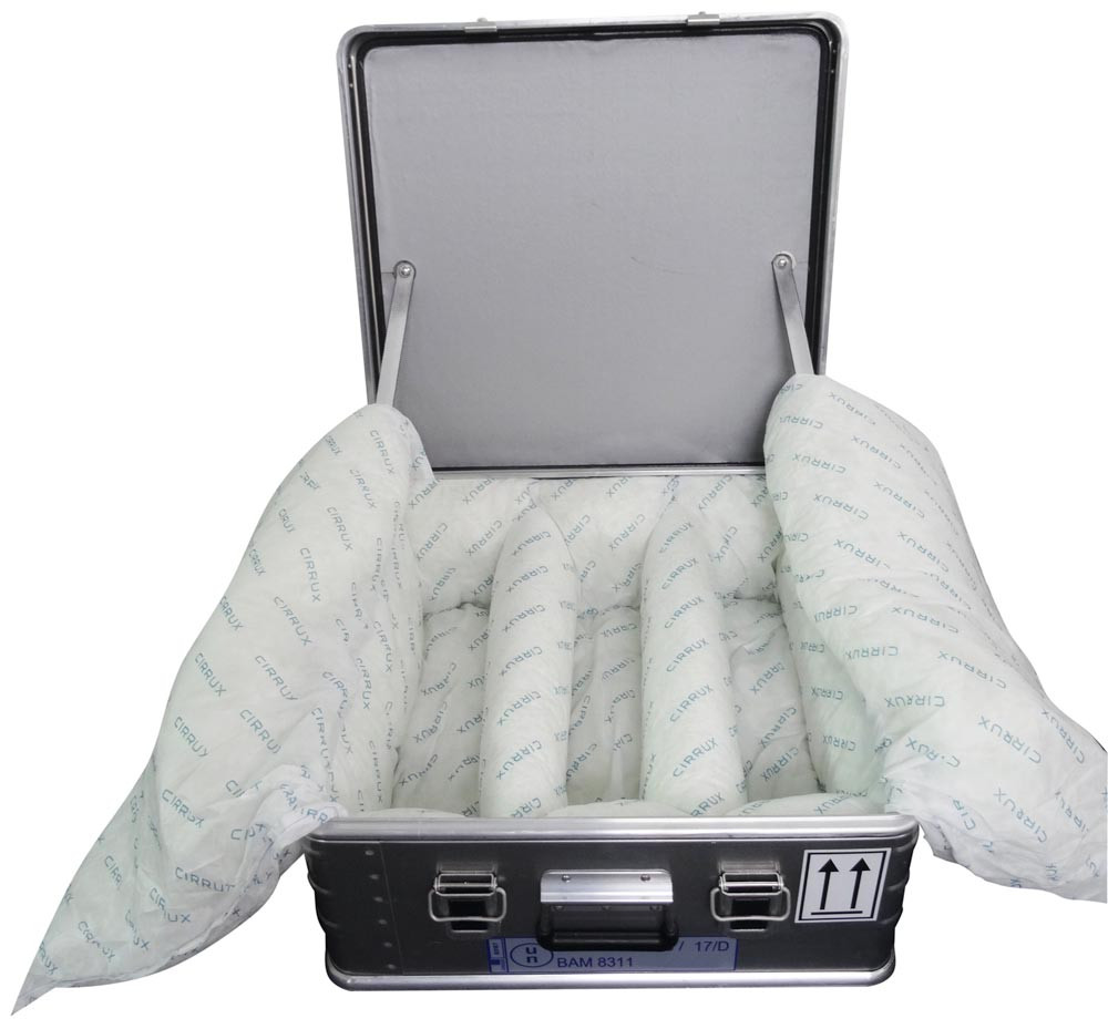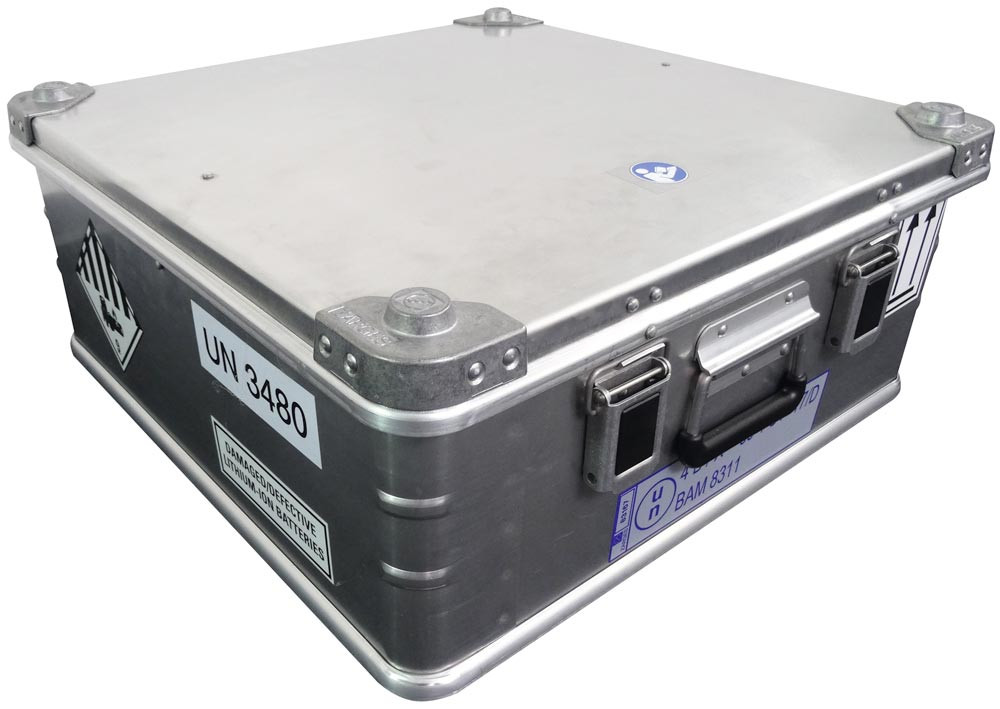 ∙ Hochwertiger Spezialbehälter aus Aluminium ∙ Zulassung für den Transport kritisch defekter Lithium Batterien mit Nennenergie bis 814 Wh, gemäß P911, SV 376 und Festlegung der BAM (Bitte entsprechend anfordern) ∙ Für die Aufbewahrung und den Transport von Prototypen (ADR P910), defekten oder beschädigten Lithium Batterien gemäß ADR SV 376 und Verpackungsvorschrift P908 ∙ Zwei Verschlüsse, je ein Griff an der Vorder- und Rückseite ∙ Mit feuerfestem Polster- und Aufsaugmaterial aus textuierten Glasfasern ∙ Staubfreie Innenausstattung ∙ Nach UN-Bestimmungen als Gefahrgutverpackung geprüft und zugelassen, d. h. vorschriftsgemäßer öffentlicher Transport möglich ∙ Brandtest erfolgreich bestanden: kein Übergreifen der Flammen auf die benachbarten Akkus ∙ Temperatur an der Behälteroberfläche bleibt unter 100 °C