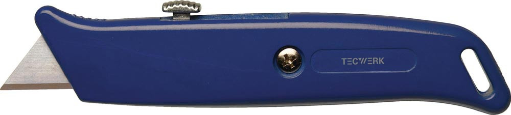 Gehäuse aus Zinkdruckguss · einziehbare Klinge · Arbeitsposition der Klinge durch Schnelleinstellung mehrfach verstellbar · geeignet für die Aufnahme von Haken- und Trapezklingen · pulverbeschichtet