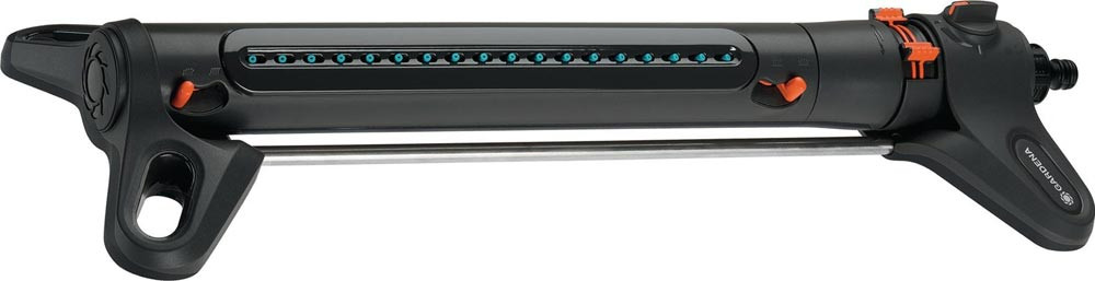 Sprengbreite (4 - 17 m) und Reichweite (7 - 21 m) stufenlos wählbar · extra weiten Standfüße · zum Schutz gegen Schmutzpartikel ist im Wasseranschluss ein rostfreier Metallfilter · UV-beständig und frostsicher
