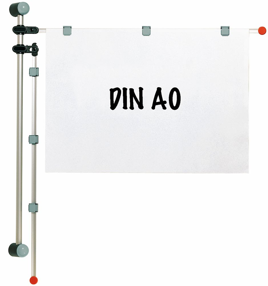 · 2 Schwenkarme 1320 mm lang für Formate bis DIN A0 mit je 3 Magnetclips · Erweiterbar auf bis zu 8 Arme · Aluminiumrohr 1000 mm lang zum Anschrauben an die Wand · Inkl. Montagematerial