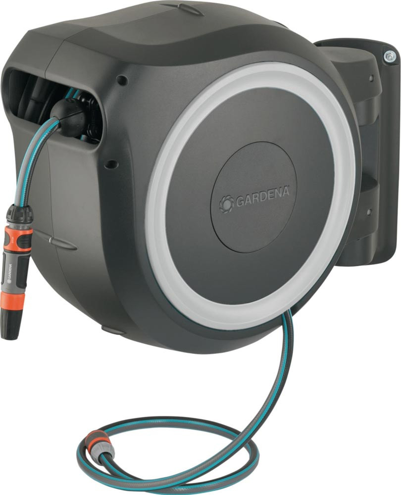 mit Anschlussschlauch, Systemteilen und Reinigungsspritze, mit 2 Sprühstrahloptionen · inkl. Wandhalterung mit Schrauben, Dübeln und Montagehilfe · wird mit der 180° schwenkbaren Halterung an einer Hauswand befestigt · mit Arretierungsstops · RollControl-Technologie · UV-beständig und frostsicher · Diebstahlschutz