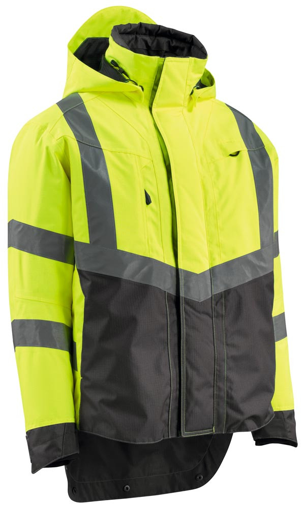 Nach EN ISO 20471 - Klasse 3, Hi-Vis Gruppe A und EN 343 3/3 ∙ Aus 100% Polyester, ca. 210 g/m2 ∙ Atmungsaktiv, wind- und wasserdicht ∙ Mit Reflexschulterstreifen sowie schrägverlaufenden Reflexen ∙ Nähte sind verklebt ∙ Futter aus Netzmaterial ∙ Kapuze, abnehmbar, gefüttert und mit Elastikschnüren regulierbar, so dass diese über einen Helm passt ∙ Netzventilation mit Reißverschluss unter den Ärmeln ∙ Stehkragen ∙ Innenkragen aus Strick ∙ Wasserdichte Stifttasche am Ärmel ∙ Verschluss mit Reißverschluss und Wetterschutzleiste mit Druckknöpfen ∙ Reißverschlussinnentaschen unter der Wetterschutzleiste – eine speziell für Handys entwickelt, mit Öffnung sowie Schlaufen für das Kopfhörerkabel ∙ Tasche mit Reißverschluss unter der Wetterschutzleiste, mit Platz für ein 7 Zoll Tablet ∙ Verlängerter Rücken durch herunterknöpfbaren Stoff zum besseren Schutz vor Wind und Wetter ∙ Brusttasche mit Reißverschluss ∙ D-Ring ∙ Ergonomisch geschnittene Ärmel ermöglichen hohe Bewegungsfreiheit ∙ Rippenbündchen an den Handgelenken ∙ Manschetten mit Verstärkungen aus CORDURA®-Gewebe und Druckknopfverschluss ∙ Vordertaschen mit Reißverschluss ∙ Für Industriewäsche-Kategorie B3 geeignet ∙ Zertifiziert nach OEKO-TEX® Standard 100