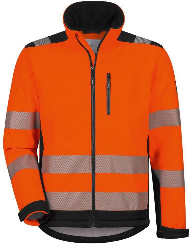 EN ISO 20471 Kl. 3 · EN ISO 13688 · Obermaterial: 100% Polyester, 3-Lagenlaminat (Softshell) , ca. 300 g/m² · Atmungsaktivität: 1000 g/m²/24 h · Wassersäule: 5000 mm · wind- und wasserdicht, sowie atmungsaktiv durch 3-Lagenlaminat · hoch abriebfestes robustes Softshell-Material · angenehm zu tragen durch Fleece-Material innen · segmentierte thermofixierte Reflexstreifen · Verstärkungen an den besonders beanspruchten Stellen · weitenregulierbarer Ärmelbund mittels Klettverschluss · Saum weitenverstellbar · 25x waschbar bei 40°C · 2 seitliche Reißverschlusstaschen · 1 Brusttasche mit Reißverschluss
