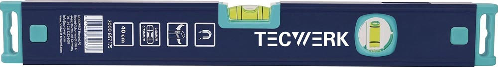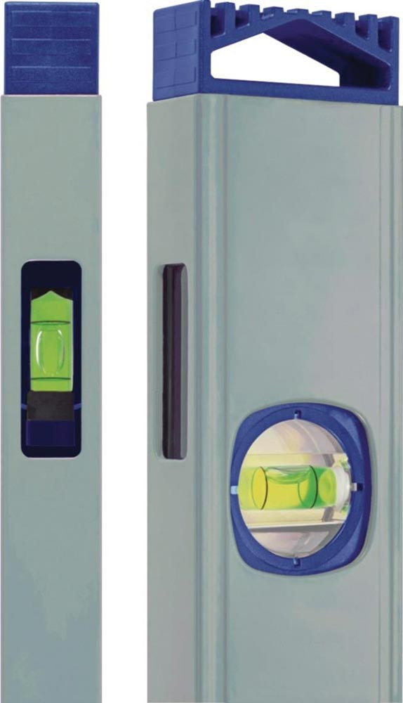 aus Aluminium · mit starken Haftmagneten · Oberfläche blau pulverbeschichtet · vergrößerte horizontale Libelle für schnellere Erkennbarkeit des Messergebnis · gefräste Messfläche · patentierte Spiegellibelle - Draufsicht auf die vertikale Libelle · Messgenauigkeit in Normalposition ± 0,5 mm/m, in Umschlagposition ± 0,75 mm/m
