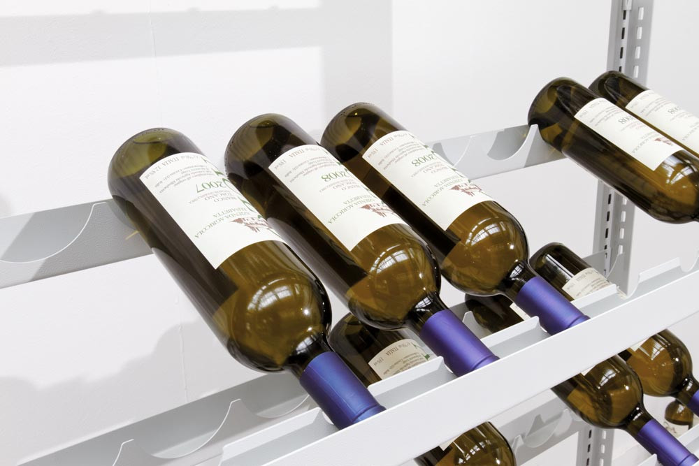 · Für die liegende Lagerung von Flaschen · Schneller Zugriff und einfache Bestückung · Sichere und übersichtliche Einlagerung der Flaschen · Vordere Leiste mit Sicherheitsanschlag · Kapazität 9 Flaschen pro Ebene