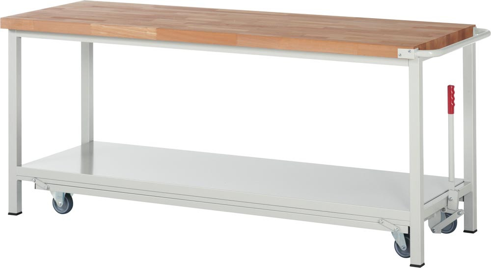 Werkbank mit absenkbarem Fahrgestell, BxTxH 2000x700x880 mm, Platte Buche 40 mm, RAL 7035, Ablageboden EP529976