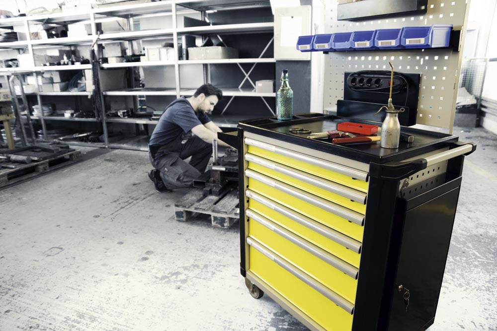 ∙ Aus hochwertigem, pulverbeschichteten Stahlblech ∙ Stabiles, geschweißtes Stahlblechgehäuse mit 400 kg Traglast ∙ 2 Bock- und 2 Lenkrollen mit Feststeller, aus Vollgummi, Ø 100 mm ∙ Schublade mit Vollauszug und einer Traglast von je 40 kg ∙ Zentralverschluss und Schubladeneinzelsicherung gegen ungewolltes Öffnen im Fahrbetrieb ∙ Stabile und ergonomisch geformte Schiebestange ∙ B x T x H 894 x 525 x 928 mm