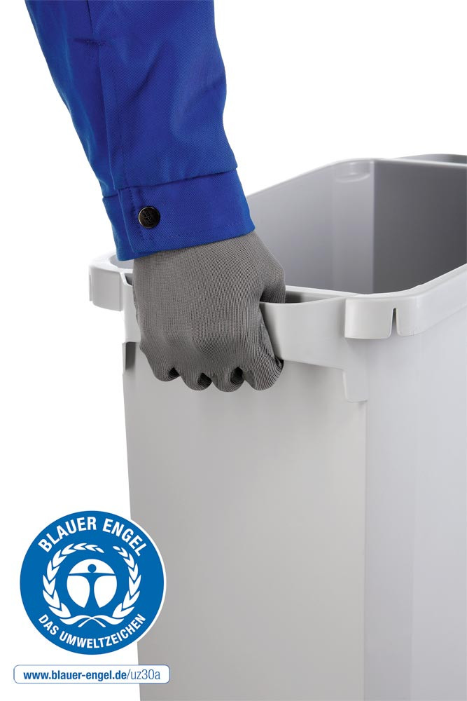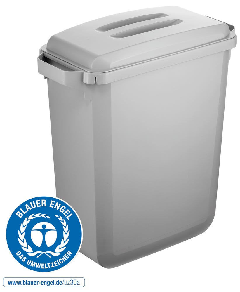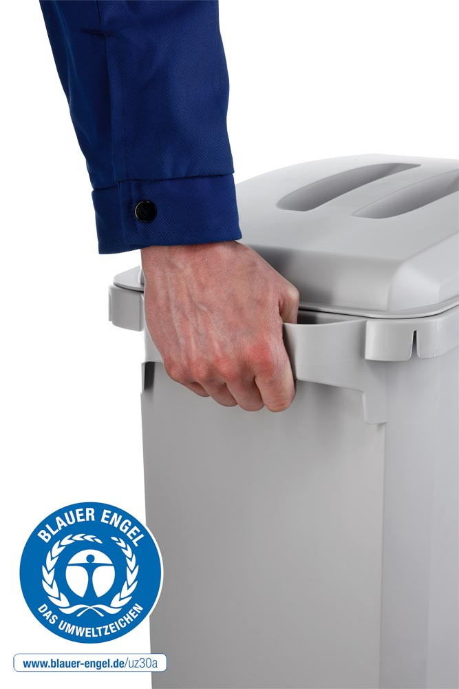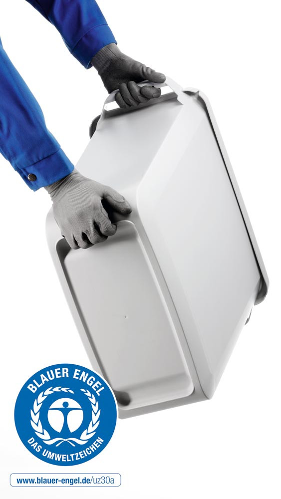 · Zum Sammeln und Trennen von Abfällen und Wertstoffen · Mit robusten Tragegriffen für einfachen Transport · Haltevertiefungen auf der Bodenunterseite zum sicheren Entleeren · Mit Klemmschlitzen für Abfallsäcke · Deckel mit Griffmulde für leichtes Abnehmen · Einsatz recycelter Kunststoffe in Blauer Engel Qualität · Nicht lebensmittelgeeignet · Volumen 60 Liter · B x T x H 590 x 282 x 645 mm