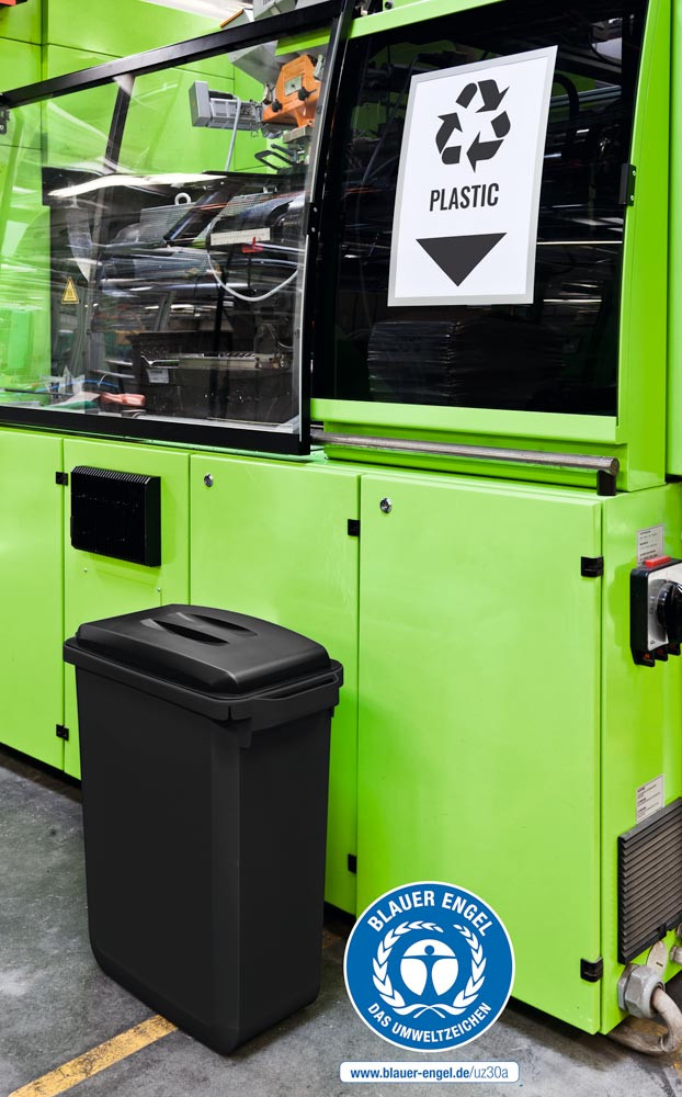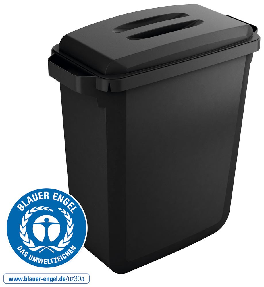 · Zum Sammeln und Trennen von Abfällen und Wertstoffen · Mit robusten Tragegriffen für einfachen Transport · Haltevertiefungen auf der Bodenunterseite zum sicheren Entleeren · Mit Klemmschlitzen für Abfallsäcke · Deckel mit Griffmulde für leichtes Abnehmen · Einsatz recycelter Kunststoffe in Blauer Engel Qualität · Nicht lebensmittelgeeignet · Volumen 60 Liter · B x T x H 590 x 282 x 645 mm