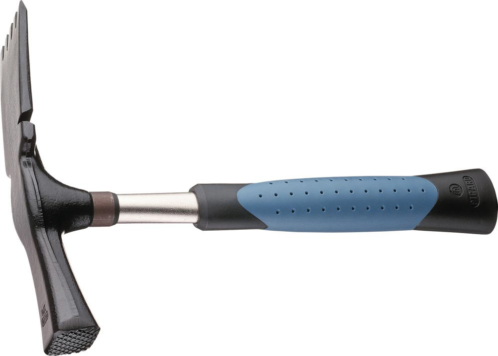 Kopf aus legiertem, gehärtetem Spezialstahl geschmiedet, fein geschliffen · gehärteter Schutzring aus Stahl für zusätzliche Sicherheit · Zahnschneide führt zu geringer Vibration beim Aufschlag · Stiel aus Chrom-Molybdän-Rohr · 2-Komponentengriff blau/schwarz