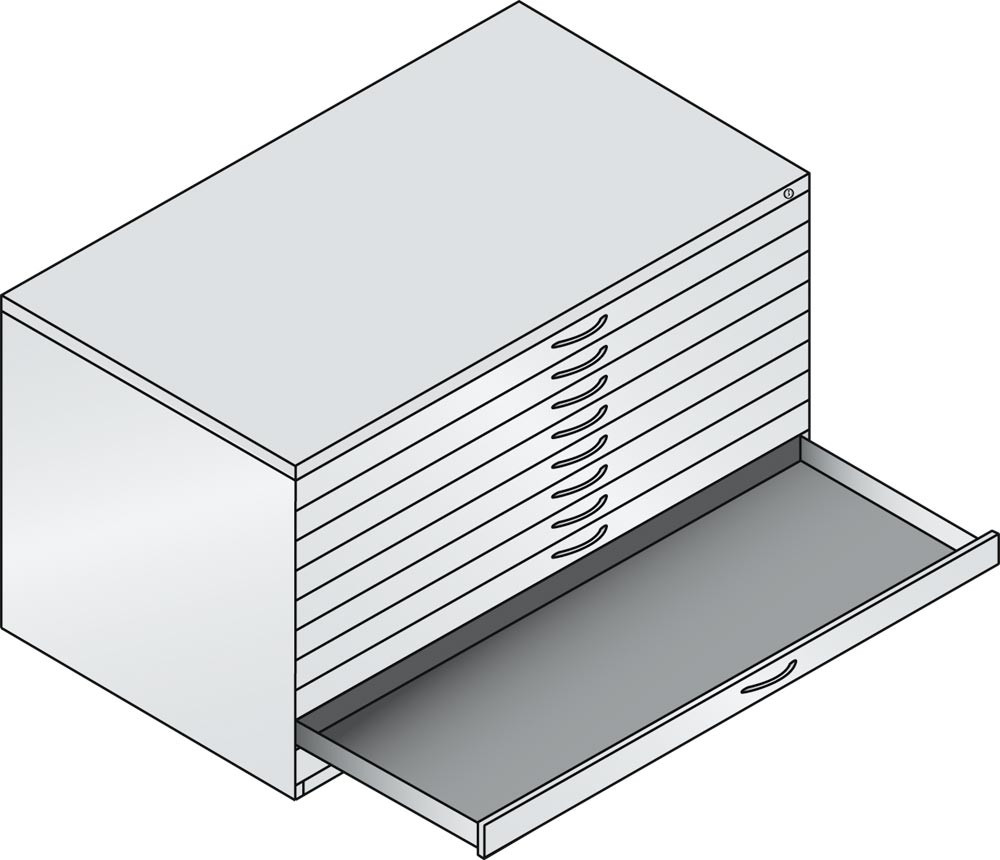 ∙ Stabile Stahlblechkonstruktion mit hochwertiger Einbrennlackierung ∙ Für Formate DIN A1 bis DIN A0 ∙ Leichtlaufende Schubladen auf Kugelrollenteleskopschienen, vorn mit Niederhalter, hinten mit Deckleiste, lichte Innenhöhe 55 mm ∙ Gelochte Schubladenböden zur Unterteilung ∙ DIN A0 zu 4/5, DIN A1 voll ausziehbar ∙ Geräuscharmes Schließen durch das ESE-System (End-Selbst-Einzug) ∙ Schubladen mit Auszugsperre gegen das gleichzeitige Öffnen von mehreren Schubladen zur Verhinderung der Kippgefahr ∙ Zentral verschließbar durch Sicherheitsschloss mit 2 Schlüsseln ∙ Formschöne, mattverchromte Bügelgriffe ∙ Traglast ca. 40 kg/Schublade ∙ Abdeckplatte, 25 mm stark und Sockel 100 mm hoch, gegen Mehrpreis