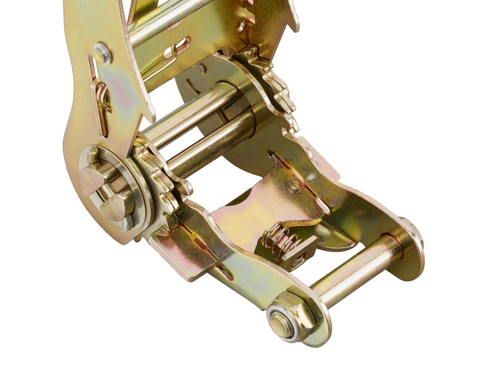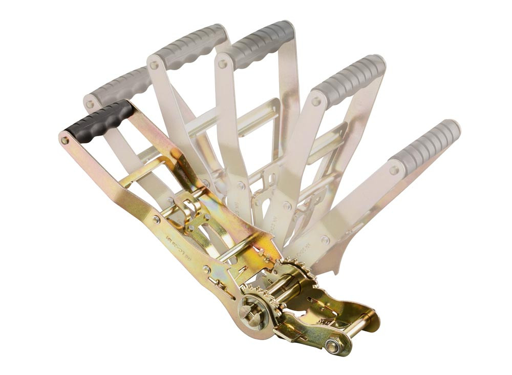 ∙ Nach DIN EN12 195-2 · Mit Druckratsche - das Gurtband wird beim "nach oben drücken" gespannt ∙ Extra langer Ratschenhebel (300 mm lang) mit 2 doppelten Zahnrädern auf beiden Seiten · Handhebelarretierung ∙ Polyurethan-imprägniertes Polyestergurtband, dadurch 10-fach höhere Scheuerfestigkeit ∙ Speziell verstrecktes Gurtband, dadurch geringere Dehnung