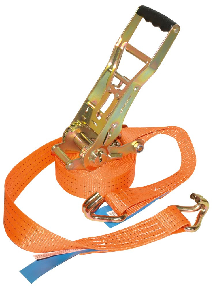 Zweiteiliger Zurrgurt, mit Rahmenhaken, 2000 daN zul. Zugkraft in der Umreifung, Gurtbreite 35 mm, Länge 6 m, Farbe orange, 2 Streifen, VE 2 Stück